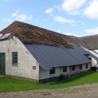 Boerderij waarvan het muurwerk gedeeltelijk bestaat uit waarschijnlijk van sloop afkomstige moppen. Rieten schilddak, oude kozijnen