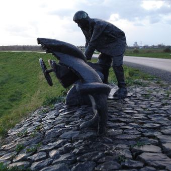 The monument displays a small boat and the figure of Arie Evegroen, commemorating the prevention of a devastating flood in South Holland.