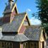 St Olaf's Church stands near Kviknes Hotel with traditional Norwegian wooden architecture, featuring dragon head decorations and horizontal timber paneling.