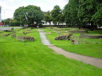 The stone foundations and remaining walls of St. Hallvard's Cathedral stand within Ruinparken, alongside other medieval structures from early Oslo.