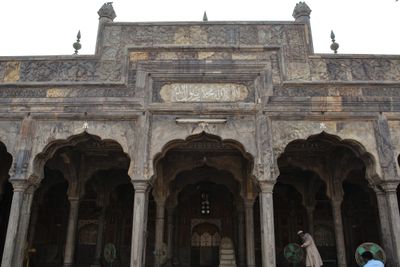 The prayer chamber contains fragments of original floral and geometric patterns, displaying the refined decorative techniques employed by Mughal artisans.