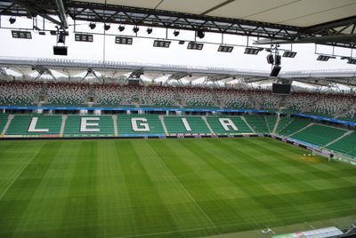 Polish Army Stadium is a football venue with approximately 31,100 seats and modern facilities including underground parking and advanced lighting for broadcasts. The facility features multiple stands, with the Żyleta stand accommodating nearly 7,500 spectators.