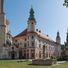 The Abbey of Henryków is a Cistercian monastery featuring a Baroque church decorated with detailed ornamental work, bell towers, and a rectangular courtyard. Monastery buildings form a connected complex around this central courtyard.