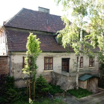 The manor house sits below street level due to ground elevation modifications made by Prussian authorities to prevent flooding in the area.