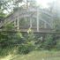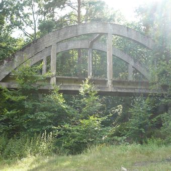 Three concrete bridge structures remain in the forest without connecting to any visible roads, creating an unusual landscape within the natural setting.