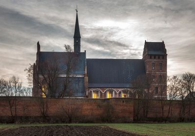 The Saint Stanislaus and Our Lady of Częstochowa church is a brick building displaying classic Gothic architectural features such as pointed arches and detailed stone decorations. Its structure follows traditional medieval building methods and showcases the craftsmanship typical of northern Polish religious architecture.