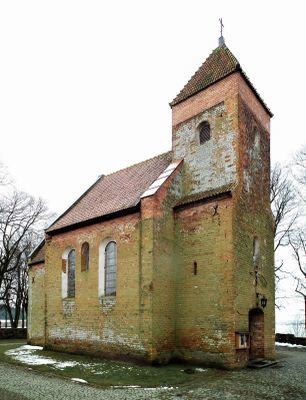 The Saints Peter and Paul Church features a square nave measuring 8.6 by 8.4 meters, with a shorter chancel and a four-sided western tower.