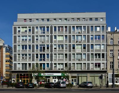 The building at Marszałkowska Street features a grey brick facade, concrete structure, and architectural elements including cornices and pilasters.