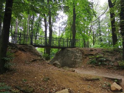 The park contains numerous walking paths, fountains, and a monastic cemetery spread across carefully maintained green spaces in the Silesian region.