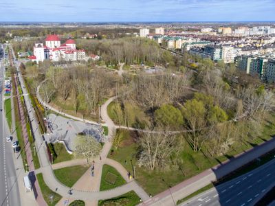 Park Przy Bażantarni extends over 5 hectares, incorporating 1.43 hectares of forest area and 4 hectares of landscaped park sections with walking paths.