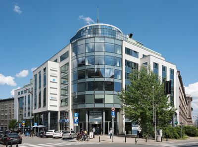 Koszykowa 54 is an office building in Warsaw's central district that houses multiple companies across its various floors. The structure provides substantial workspace spread across different levels, with entrances accessible from nearby streets.