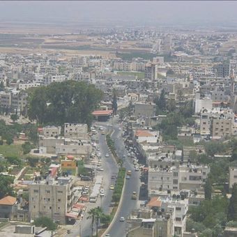 Jenin is a city in the northern part of the West Bank in Palestine, where streets are lined with residential buildings, shops, and small businesses. The surrounding area shows gentle hills with olive trees and orchards, while the city center features a busy market area.