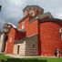 The red-colored religious complex includes the Church of the Holy Dormition, constructed with stone and brick in medieval Serbian architectural style.