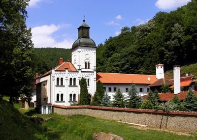 The monastery encompasses multiple buildings centered around a church constructed in the Resava architectural style with traditional Serbian design elements.