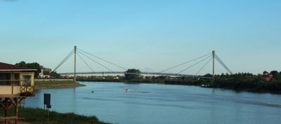 The Saint Irinej Footbridge extends across the Sava River, connecting two sections of Sremska Mitrovica with a modern pedestrian crossing structure.