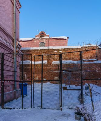The Vladimir Central Prison contains thick brick walls surrounding multiple cell blocks designed to house over 1,200 inmates in maximum security conditions.