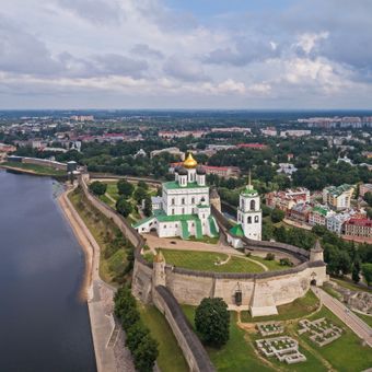 The Trinity Cathedral within the kremlin walls houses tombs of princes Vsevolod and Dovmont, reflecting the religious significance of medieval Pskov.