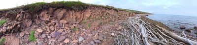 Cape Korabl extends along the northern coastline of Russia, featuring distinct geological formations with exposed layers of mineral-rich rocks and amethyst deposits.