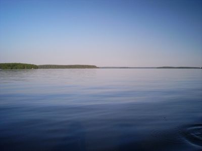 The Volchikhinskoye reservoir stretches 12 kilometers with multiple islands, surrounded by mixed forests of pine and birch trees along its shores.