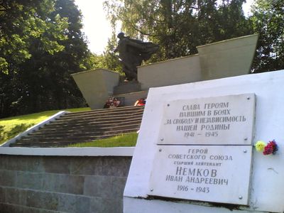 Built between 1946 and 1975, this memorial honors Heroes of the Soviet Union G.D. Kostiyev and I.A. Nemkov who fought during World War II.