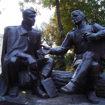 The monument shows the bond between the poet and his creation Terkin, who became a symbol of Soviet resilience during wartime. The two figures sit together as if sharing the story that shaped their shared legacy.