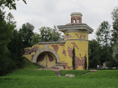 The German-Russian architect Yury Felten designed and built this tower between 1771 and 1773 during Catherine II's reign. Artist A. Belsky later added artificial cracks to its exterior plaster in 1773 to create the appearance of age and decay.