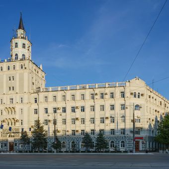 The building known as the Death Tower is a multi-story administrative structure in Perm with a three-tiered corner section that rises above Komsomolskaya Square. The structure stands at the intersection of Heroes Khasan Street and Komsomolsky Avenue and currently houses the Perm Territory Internal Affairs Department.