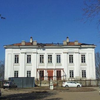 The Naryshkin Country Estate in Kuntsevo is an 18th-century classical mansion built of red stone with tall windows and an Orthodox chapel. The property includes two side wings, a park with sculptures, and a memorial column arranged around the main house on protected grounds.