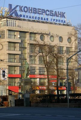 Architect Gregori Barkhin completed this building in 1927 during the early Soviet period, marking a transition in Russian architectural approaches and media establishments.