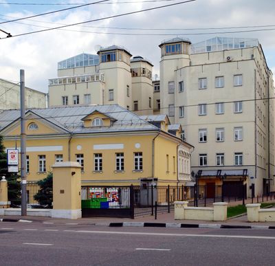 The mansion at Bolshaya Polyanka street exhibits traditional Russian architectural elements with symmetrical windows and decorative stone ornaments across the facade.