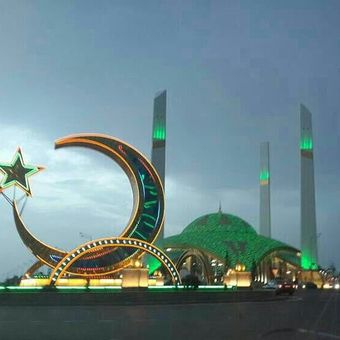Three 55-meter minarets rise above the central dome of the Aymani Kadyrova Mosque, which features marble walls and illuminated interior paintings.