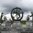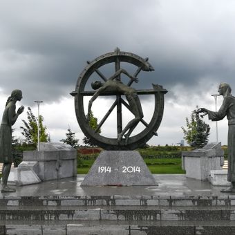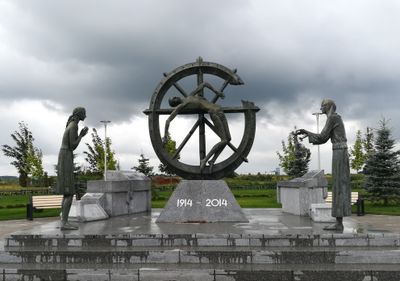 The monument consists of three bronze figures: a soldier crucified on a wheel and two women reaching out to him.