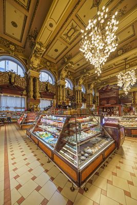 The interior of the store features hand-painted ceiling decorations, tall arches, and intricate tiled floors within a former merchant palace building.