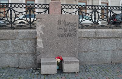 The monument inscription commemorates the determination of Leningrad inhabitants who collected water from this ice hole during the wartime blockade.
