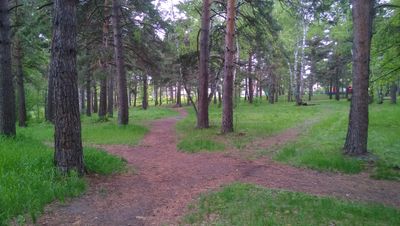 The park extends over 130 hectares along the shore of the Ob Reservoir, featuring old pine trees, birches, lindens and mountain ash trees.