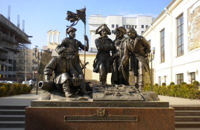 This bronze ensemble presents the founders examining construction plans while Ataman Yefremov sits on a cannon and a Cossack holds a flag.