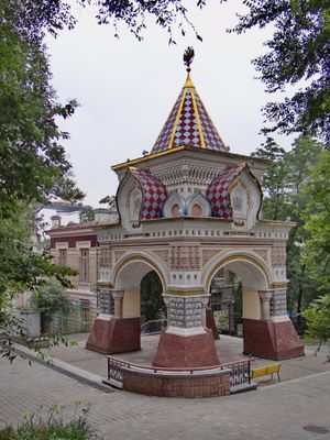 The Russian-Byzantine style arch features four stone foundations, grey-yellow walls with traditional patterns, and an octahedral pyramid topped by a gilt two-headed eagle.