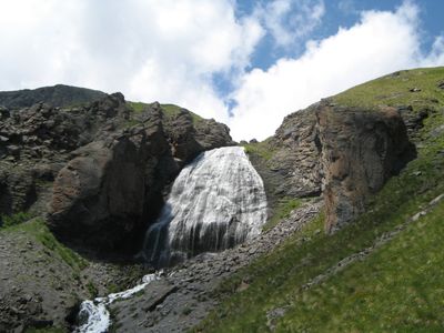 Visitors can reach the waterfall through marked hiking trails from Terskol settlement, with guided tours available during spring and summer months.