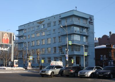 Built during the 1930s, this structure served as a central office for Aeroflot airlines, marking the development of Soviet civil aviation in Siberia.