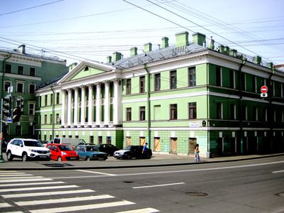 The building sits at the corner of Gorokhovaya Street and the Fontanka River embankment, within walking distance of Sennaya Ploshchad metro station. The river-facing elevation is easily visible from the embankment walk, making it accessible for visitors to view its classical proportions.