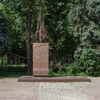 The memorial stands at the exact location of the house where both Soviet Union Heroes lived from 1933 until 1941 before their deaths in World War II.
