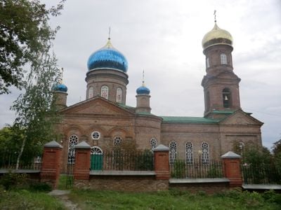 The Ascension Church stands in Stary Oskol with traditional Orthodox architectural elements including domes, arches, and religious iconography throughout the structure.