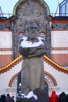 The granite monument of Pavel Tretyakov stands 4 meters tall near the entrance of the Tretyakov Gallery in central Moscow.