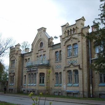 The mansion combines Russian pseudo-gothic architecture with Art Nouveau elements, featuring symmetrical wings and stylized archivolts on its exterior facades.