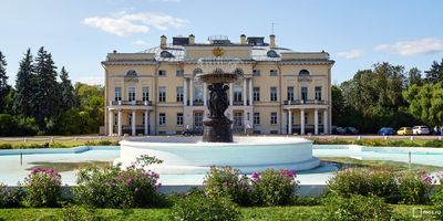Главные въездные ворота дворца со скульптурными группами «Времена года» и фонтаном перед дворцом (Якиманка)