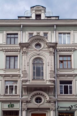 The structure represents the architectural trends of late 19th century Moscow with its detailed stonework and intricate window arrangements.