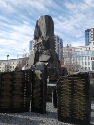The memorial contains 38 black stones of irregular shape, each displaying names of individuals who lost their lives during counter-terrorism operations in Chechnya.