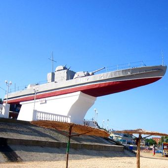 The Monument to the Sailors of the Azov Flotilla features a Komsomolets-class torpedo boat mounted on a concrete pedestal near the waterfront.