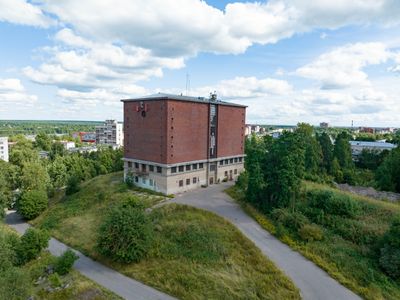 The Vyborg main water tower combines functionalist and Nordic classical design elements in its vertical structure with clean geometric lines and industrial features.
