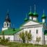 The Transfiguration Church features traditional Russian Orthodox architecture with domes, light drums, and characteristic exterior decorative elements combining white walls and intricate details.